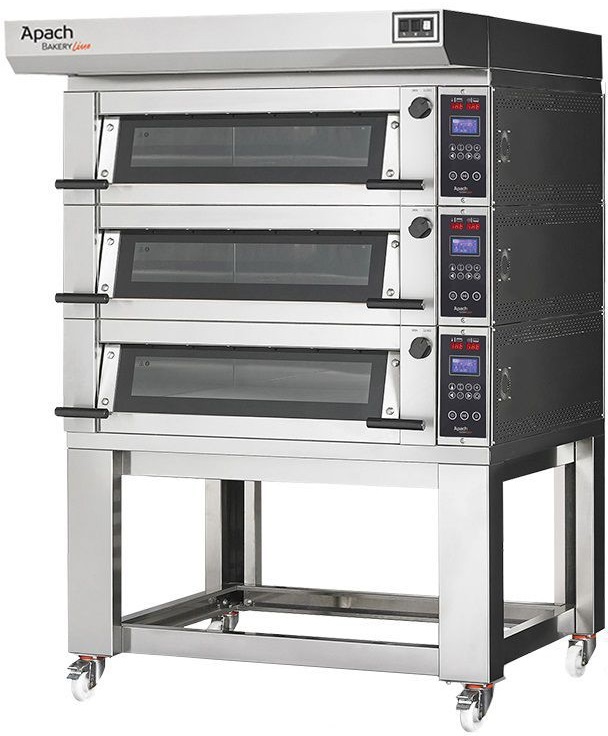 Печь подовая Apach Bakery Line E4LK7L DPBI-T серии E используется на предприятиях общественного питания, торговли, пищевых производствах, в пекарнях и кондитерских для приготовления различных блюд, выпечки хлебобулочных и кондитерских изделий. Модель оборудована цифровым управлением с раздельным контролем температур: верх/низ, вытяжкой пара, независимым парогенератором на каждый под, соединительным комплектом для воды и электричества, дверьми со смотровым окном и подставкой на колесах. Материал козырька, подставки и корпуса - высококачественная нержавеющая сталь, материал основания - цементный агломерат с металлическим каркасом, материал теплоизоляции - минеральная вата.