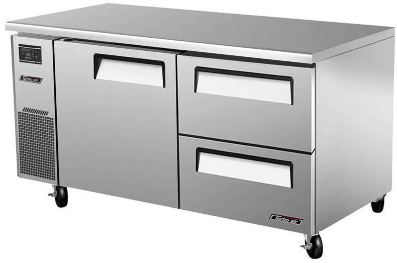 Холодильный стол Turbo air KUR15-2D-2 предназначен для раскатки теста, обработки, охлаждения и кратковременного хранения продуктов и напитков на предприятиях общественного питания и торговли. Корпус выполнен из нержавеющей стали (гальванизированная сталь на оборотной стороне и внизу) с применением пожаробезопасных стенок толщиной 60 мм, уплотнения - из АБС-пластика (акрилонитрилбутадиенстирола), не пропускающего конденсата, пол - из нержавеющей стали с алюминиевыми вставками по бокам и сзади оборудования, тройные направляющие - из высококачественной нержавеющей стали.