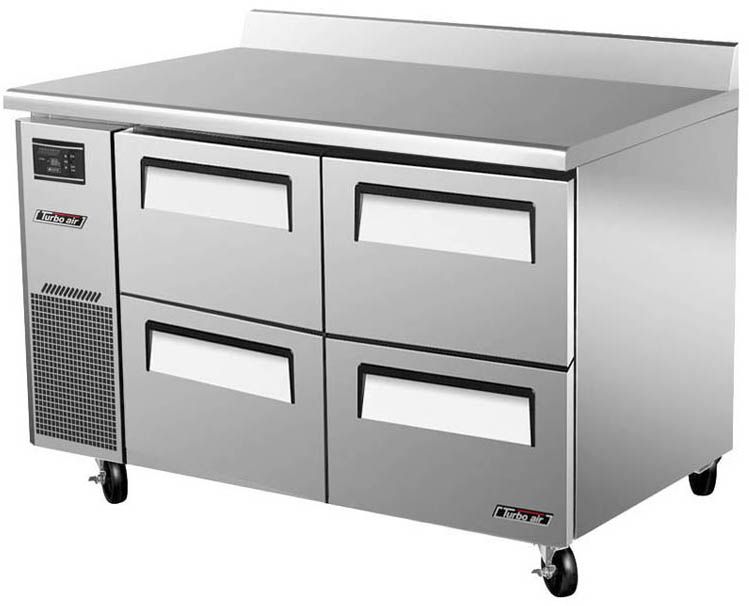 Холодильный стол Turbo air KWR12-2D-4 предназначен для раскатки теста, обработки, охлаждения и кратковременного хранения продуктов и напитков на предприятиях общественного питания и торговли. Корпус выполнен из нержавеющей стали (гальванизированная сталь на оборотной стороне и внизу) с применением пожаробезопасных стенок толщиной 60 мм, уплотнения - из АБС-пластика (акрилонитрилбутадиенстирола), не пропускающего конденсата, пол - из нержавеющей стали с алюминиевыми вставками по бокам и сзади оборудования, тройные направляющие - из высококачественной нержавеющей стали.