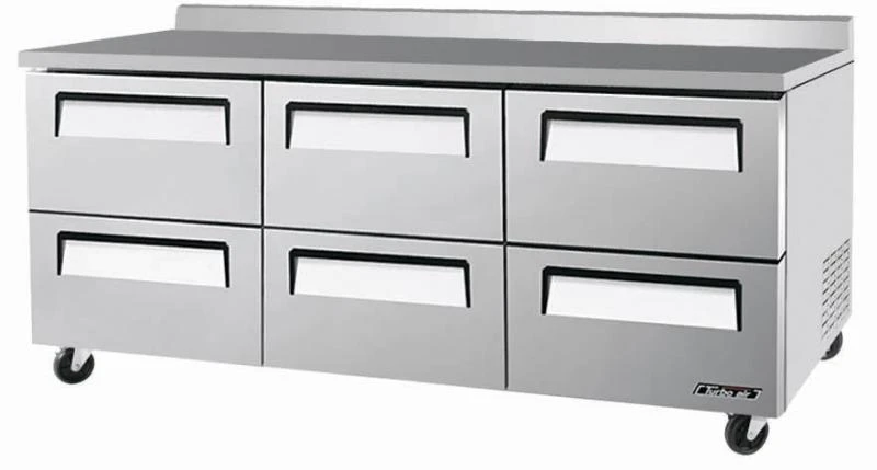 Холодильный стол Turbo air CMWR-72-2D-6 используется на предприятиях общественного питания, торговли и пищевых производствах для обработки, охлаждения и кратковременного хранения продуктов, а также для раскатки теста. Стол оснащен динамической системой охлаждения, аналоговым управлением и установлен на 4 колеса (2 фронтальные со стопорами). Материал корпуса и направляющих - нержавеющая сталь, материал задней стенки и пола - гальванизированная сталь, материал пола - нержавеющая сталь с алюминиевыми вставками, материал регулируемых полок - толстая стальная проволока с виниловым покрытием.