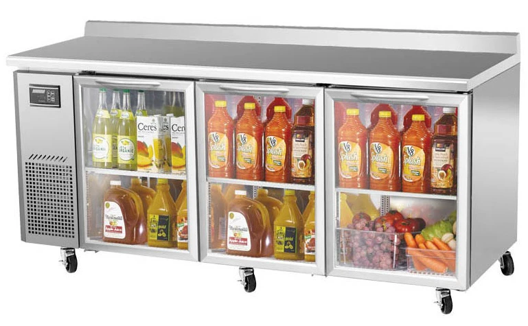 Холодильный стол Turbo air KGWR18-3-750 используется на предприятиях общественного питания, торговли и пищевых производствах для обработки ингредиентов, приготовления блюд, а также демонстрации и кратковременного охлаждения продуктов и напитков. 3 стеклянные двери, 3 регулируемые полки. Материал корпуса и дверных петель - нержавеющая сталь, материал задней и нижней панели - гальванизированная сталь, материал пола - нержавеющая сталь с алюминиевыми вставками, материал полок - толстая стальная проволока с виниловым покрытием, материал уплотнения - ABS-пластик.