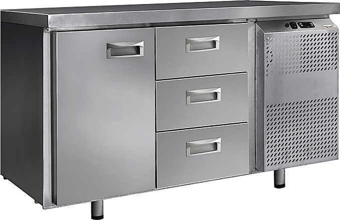 Холодильный стол Finist СХС-600-1/3 используется на предприятиях общественного питания, торговли и пищевых производствах для хранения и обработки полуфабрикатов из мяса и рыбы, заготовок для салата, охлажденных напитков и прочих пищевых продуктов. Управление при помощи кнопочной панели управления, оснащенной цифровым дисплеем. Холодильная камера с распашной дверцей, 3 выдвижных ящика, агрегатный отсек располагается сбоку. Стол установлен на ножки с подпятниками. Материал корпуса - нержавеющая сталь.