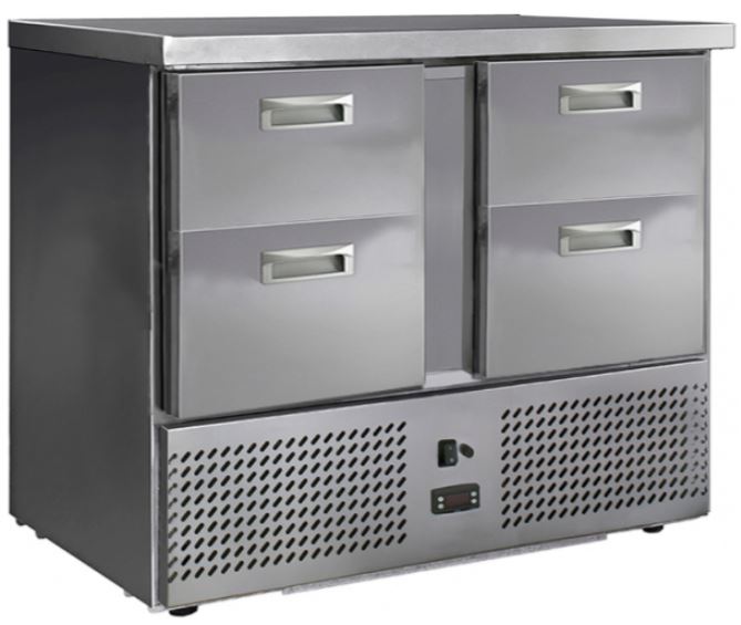 Холодильный стол Finist СХСн-700-0/4 используется на предприятиях общественного питания, торговли и пищевых производствах для хранения и обработки полуфабрикатов из мяса и рыбы, заготовок для салата, охлажденных напитков и прочих пищевых продуктов. Управление при помощи кнопочной панели управления, оснащенной цифровым дисплеем. 4 выдвижных ящика, агрегатный отсек располагается сбоку. Стол установлен на ножки с подпятниками. Материал корпуса - нержавеющая сталь.