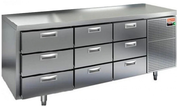 Холодильный стол HICOLD GN 333/TN O используется на предприятиях общественного питания, торговли и пищевых производствах для обработки различных ингредиентов и хранения продуктов, напитков и кухонных принадлежностей. Модель оснащена электронной панелью управления, динамической системой охлаждения, автоматической оттайкой, ящиками и регулируемыми ножками. Материал корпуса и столешницы - высококачественная нержавеющая сталь, материал задней стенки - оцинкованная сталь.