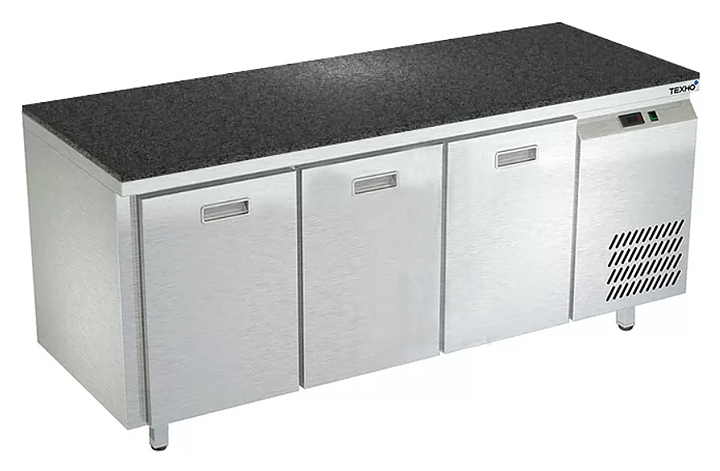 Холодильный стол Техно-ТТ СПБ/О-323/03-1806 предназначается для раскатки теста, обработки, охлаждения и кратковременного хранения продуктов и напитков на предприятиях общественного питания, торговли и пищевых производствах. Секции оснащены направляющими и ящиками с доводчиками. Материал корпуса - нержавеющая сталь AISI 430, материал столешницы - гранит (толщина 20 мм), материал задней панели и дна - оцинкованная сталь.