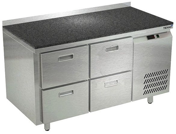 Холодильный стол Техно-ТТ СПБ/О-423/04-1307 предназначается для раскатки теста, обработки, охлаждения и кратковременного хранения продуктов и напитков на предприятиях общественного питания, торговли и пищевых производствах. Секции оснащены направляющими и ящиками с доводчиками. Материал корпуса - нержавеющая сталь AISI 430, материал столешницы - гранит (толщина 20 мм), материал задней панели и дна - оцинкованная сталь.