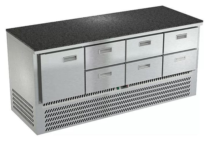 Холодильный стол Техно-ТТ СПН/О-322/16-1907 предназначается для раскатки теста, обработки, охлаждения и кратковременного хранения продуктов и напитков на предприятиях общественного питания, торговли и пищевых производствах. Секции оснащены направляющими и ящиками с доводчиками. Материал корпуса - нержавеющая сталь AISI 430, материал столешницы - гранит (толщина 20 мм), материал задней панели и дна - оцинкованная сталь.