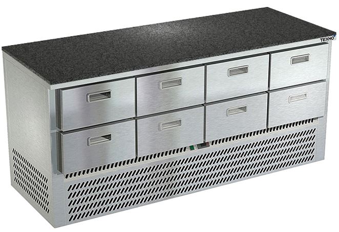Холодильный стол Техно-ТТ СПН/О-323/08-1906 предназначается для раскатки теста, обработки, охлаждения и кратковременного хранения продуктов и напитков на предприятиях общественного питания, торговли и пищевых производствах. Секции оснащены направляющими и ящиками с доводчиками. Материал корпуса - нержавеющая сталь AISI 430, материал столешницы - гранит (толщина 20 мм), материал задней панели и дна - оцинкованная сталь.