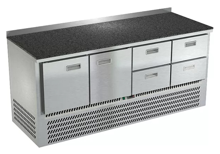 Холодильный стол Техно-ТТ СПН/О-422/24-1907 предназначается для раскатки теста, обработки, охлаждения и кратковременного хранения продуктов и напитков на предприятиях общественного питания, торговли и пищевых производствах. Секции оснащены направляющими и ящиками с доводчиками. Материал корпуса - нержавеющая сталь AISI 430, материал столешницы - гранит (толщина 20 мм), материал задней панели и дна - оцинкованная сталь.