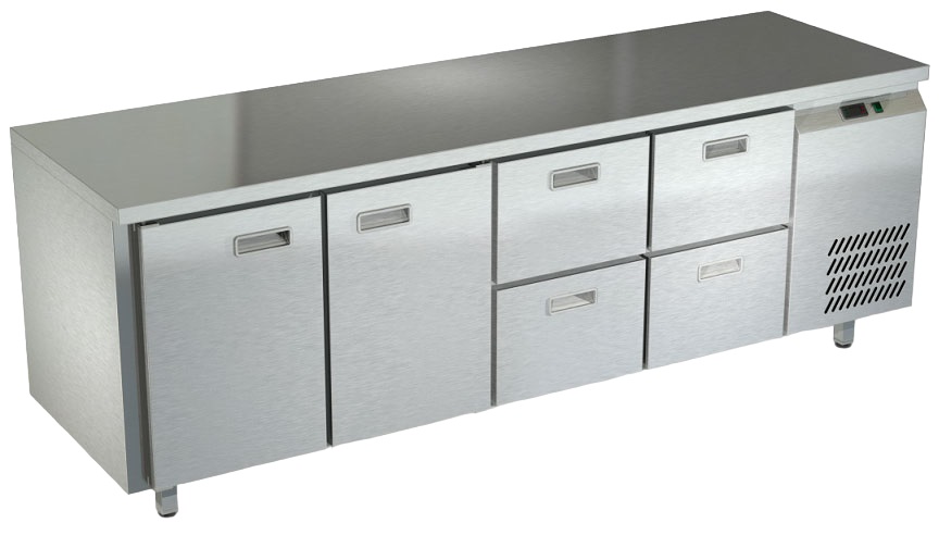 Холодильный стол Техно-ТТ СПБ/Т-122/24-2207 предназначается для раскатки теста, обработки продуктов и ингредиентов, заморозки и хранения продукции, а также для размещения теплового оборудования на предприятиях общественного питания, торговли и пищевых производствах. Двери оснащены доводчиками. Материал корпуса и столешницы - нержавеющая сталь AISI 430, материал дна и задней панели - оцинкованная сталь.