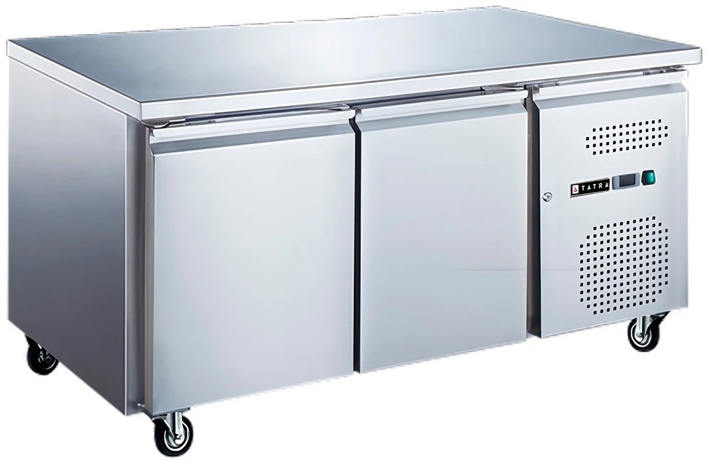 Холодильный стол Tatra TRTGN2 TN используется на предприятиях общественного питания, торговли и пищевых производствах для охлаждения и кратковременного хранения различных блюд, напитков и продуктов, а также для раскатки теста и обработки ингредиентов. Модель оснащена 3 секциями с самозакрывающимися глухими дверьми с магнитным уплотнителем и цифровым термостатом. Материал корпуса и столешницы - нержавеющая сталь, теплоизоляция выполнена из полиуретана.