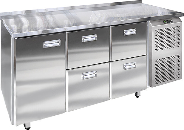 Холодильный стол Finist УХС-700-1/4 используется на предприятиях общественного питания, торговли и пищевых производствах для хранения и обработки полуфабрикатов из мяса и рыбы, заготовок для салата, охлажденных напитков и прочих пищевых продуктов. Управление при помощи кнопочной панели управления, оснащенной цифровым дисплеем. 1 холодильная камера с распашными дверцами, 1 секция с 4 выдвижными ящиками с доводчиками, агрегатный отсек располагается сбоку. Стол установлен на ножки с подпятниками. Материал корпуса - нержавеющая сталь.
