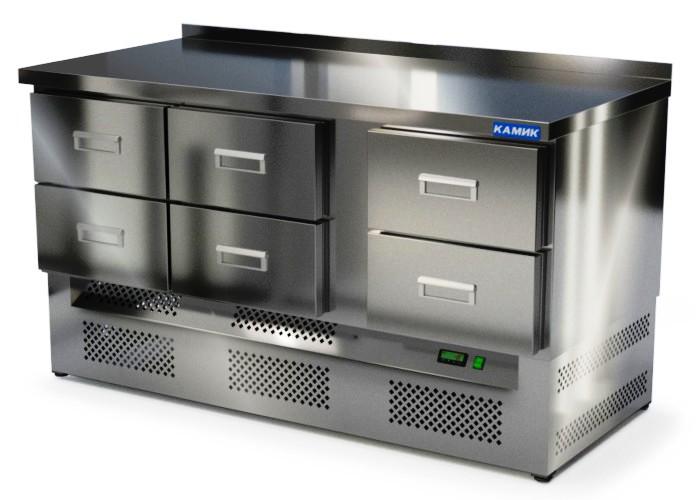 Холодильный стол КАМИК СО-06156Н используется на предприятиях общественного питания и торговли для охлаждения и хранения продуктов, напитков и готовых блюд. Конструкция разделена на секции, каждая из которых оборудована сетчатой полкой и парой направляющих. Корпус выполнен из нержавеющей стали AISI 430 толщиной 1 мм, столешница - из нержавеющей стали AISI 304 толщиной 1,5 мм.