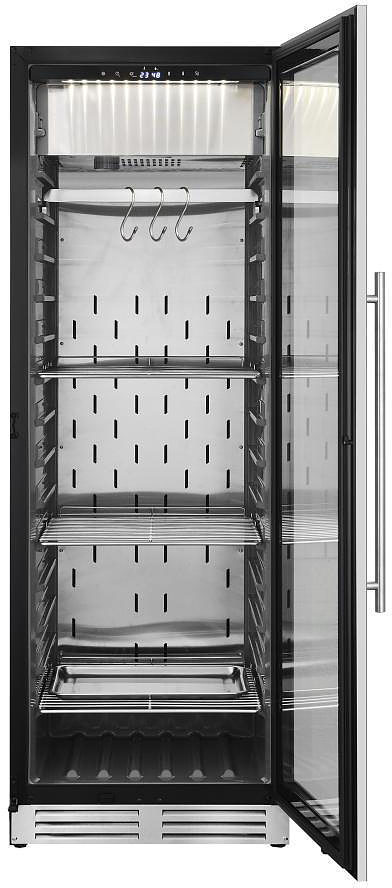 Шкаф для мяса MeatAge VI180 WT предназначен для охлаждения и вызревания мяса, ветчины и салями в частных домах, квартирах, отелях и офисах. Модель оснащена акустической сигнализацией и запираемой дверью. Корпус и комплектующие выполнены из нержавеющей стали AISI 304, дверца - из ударопрочного закаленного стекла.