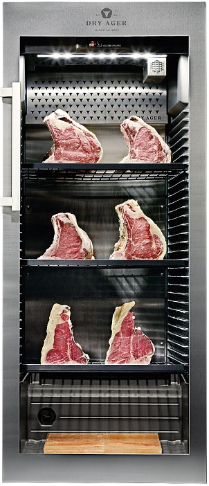 Шкаф для вызревания мяса DRY AGER DX 1000 Premium S предназначен для сухого вызревания говядины, а также производства мясных закусок и колбасных изделий на предприятиях пищевой промышленности, общественного питания и торговли. Модель оснащена электронным контроллером температуры и влажности и регулируемыми по высоте ножками. Дверная рама выполнена из нержавеющей стали, корпус - из стали, окрашенной порошковой краской, задняя стенка - из чёрной стали с матовой поверхностью, дверца - из стекла с УФ-фильтром.