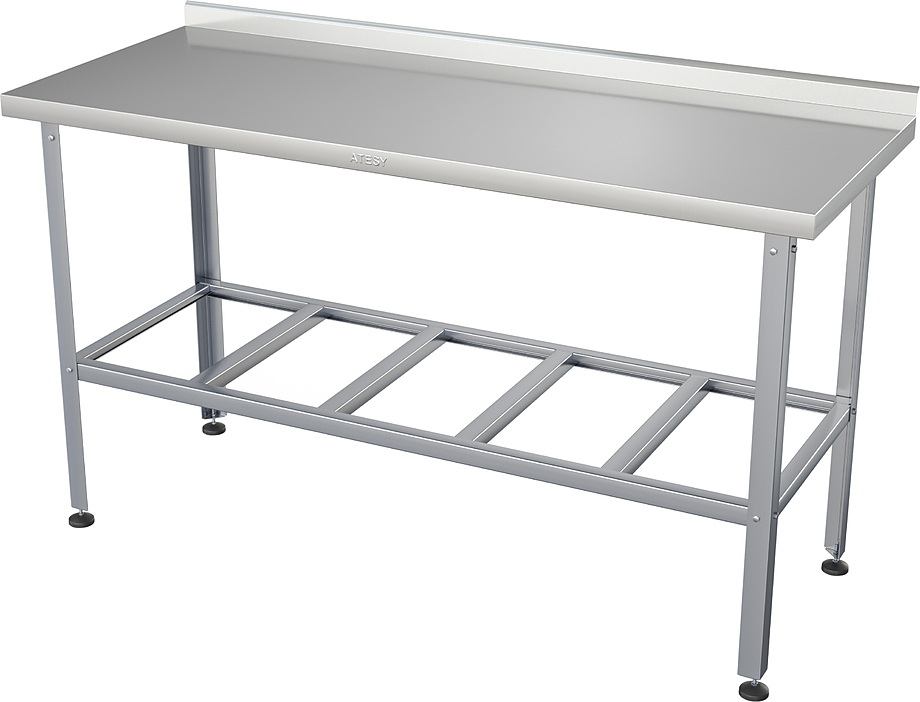 Производственный стол ATESY СР-С-1-1500.600-02 серии Стандарт предназначен для раскатки теста и обработки ингредиентов на предприятиях общественного питания и торговли. Полка-решетка и каркас выполнены из оцинкованной стали толщиной 1,2 мм, столешница - из нержавеющей стали AISI 430 толщиной 0,8 мм, ножки - из нержавеющей стали, опора ножек - из пластика.