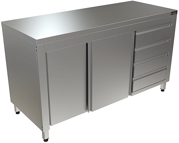 Стол производственный Кобор СТ/1-150/60/К используется на предприятиях общественного питания, торговли и пищевых производствах для хранения кухонной утвари и обработки различных ингредиентов перед приготовлением. Материал каркаса - высококачественная нержавеющая сталь (труба 40х40 мм), материал столешницы - высококачественная нержавеющая сталь AISI 430, усиленная листом ЛДСП (толщина 16 мм).
