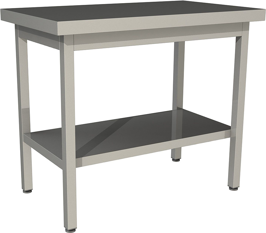 Производственный стол Restoinox СП-4/6-П серии 600 предназначен для обработки продуктов питания, раскатки теста, хранения кухонного инвентаря и оборудования на предприятиях общественного питания, торговли и пищевых производствах. Опоры ножек регулируются по высоте. Материал каркаса - нержавеющий профиль (40х40 мм), материал рабочей поверхности - нержавеющая сталь AISI 430, материал полки - сплошная нержавеющая сталь.