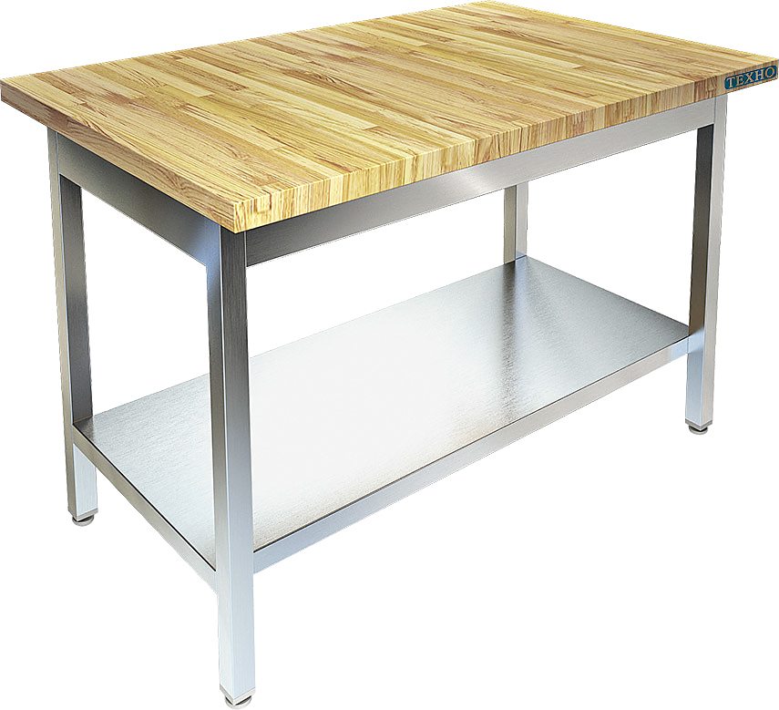 Кондитерский стол Техно-ТТ СП-353/1708 предназначен для раскатки теста и обработки ингредиентов для приготовления кондитерских и хлебобулочных изделий, а также для расстановки и хранения посуды и кухонного инвентаря на предприятиях общественного питания, торговли и пищевых производствах. Модель оснащена регулируемыми по высоте ножками, что позволяет компенсировать неровности пола. Материал разборного каркаса - уголок (40x40 мм) из нержавеющей стали AISI 430, материал сплошной полки-накладки - нержавеющая сталь AISI 430, материал столешницы - бук.