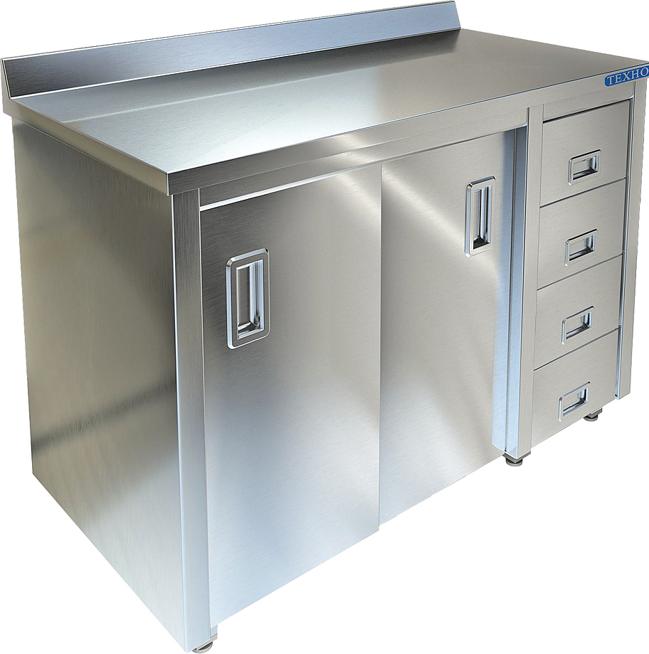 Производственный стол-тумба Техно-ТТ СПС-226/808Н-Л предназначен для разделки и обработки пищевых продуктов, а также для расстановки и хранения посуды и кухонного инвентаря на предприятиях общественного питания, торговли и пищевых производствах. Стол оснащен бортом, 1 распашной дверью и 4 выдвижными ящиками. Материал корпуса, полки и задней стенки - нержавеющая сталь AISI 430, материал столешницы - нержавеющая сталь AISI 304.