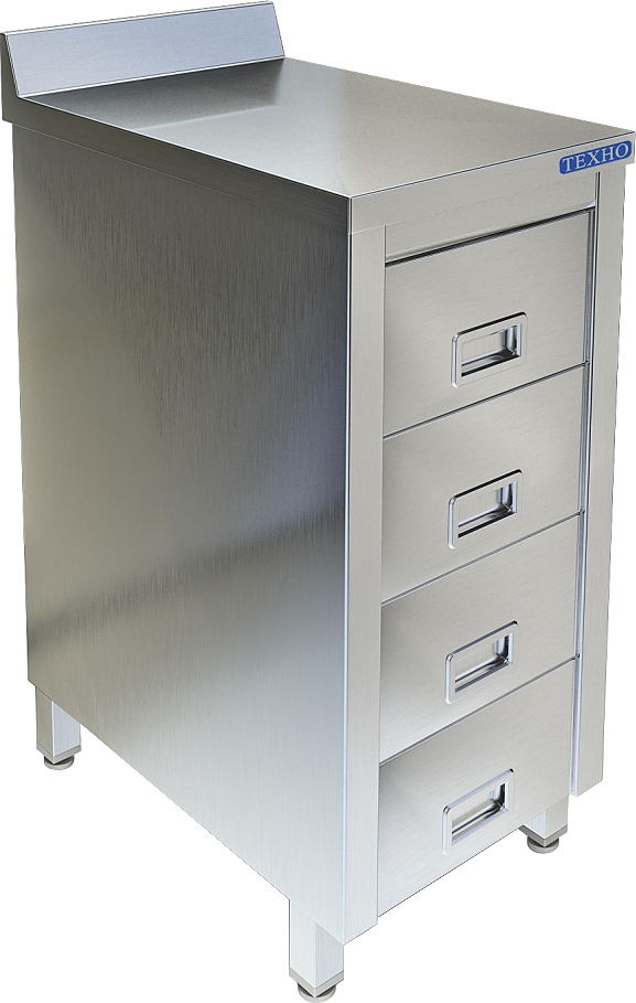 Производственный стол-тумба Техно-ТТ СПС-226/708Н предназначен для разделки и обработки пищевых продуктов, а также для расстановки и хранения посуды и кухонного инвентаря на предприятиях общественного питания, торговли и пищевых производствах. Стол оснащен бортом и 4 выдвижными ящиками. Материал корпуса, ящиков и столешницы - нержавеющая сталь AISI 304, материал задней стенки - нержавеющая сталь AISI 430.
