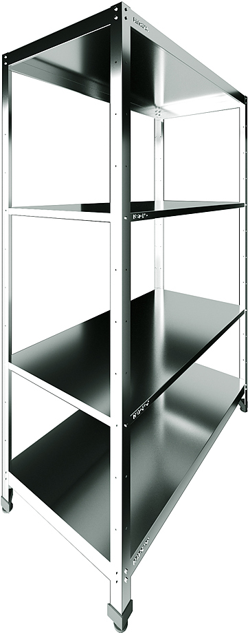 Кухонный стеллаж Restoinox СТП-19/4 используется на предприятиях общественного питания, торговли и пищевых производствах для хранения кухонного инвентаря, посуды и различной продукции. Стеллаж оснащен ребрами жесткости. Материал разборного каркаса и ребер жесткости - уголок из нержавеющей стали, материал полок - нержавеющая сталь AISI 430 (толщина 0.8 мм).