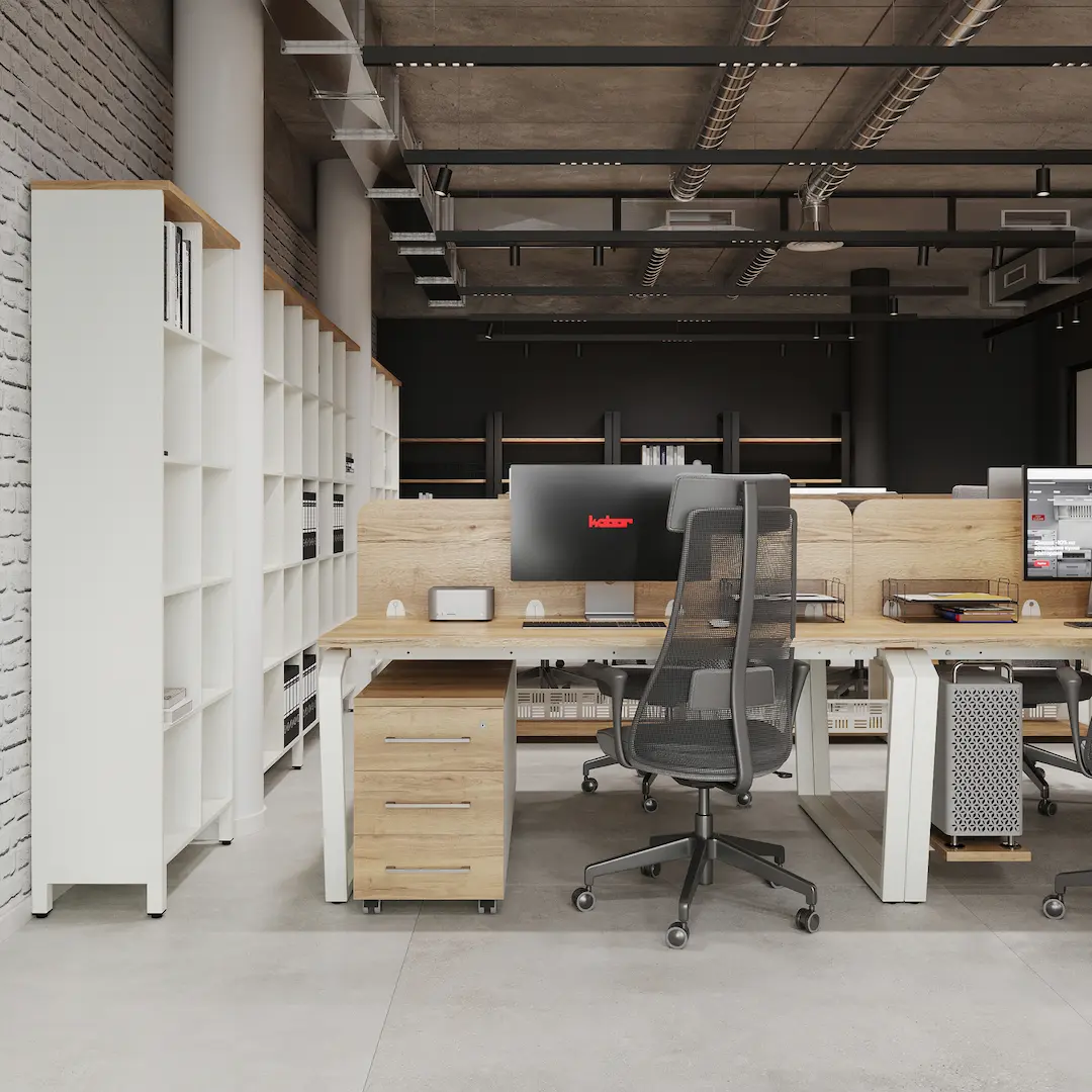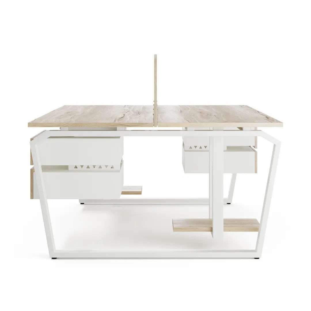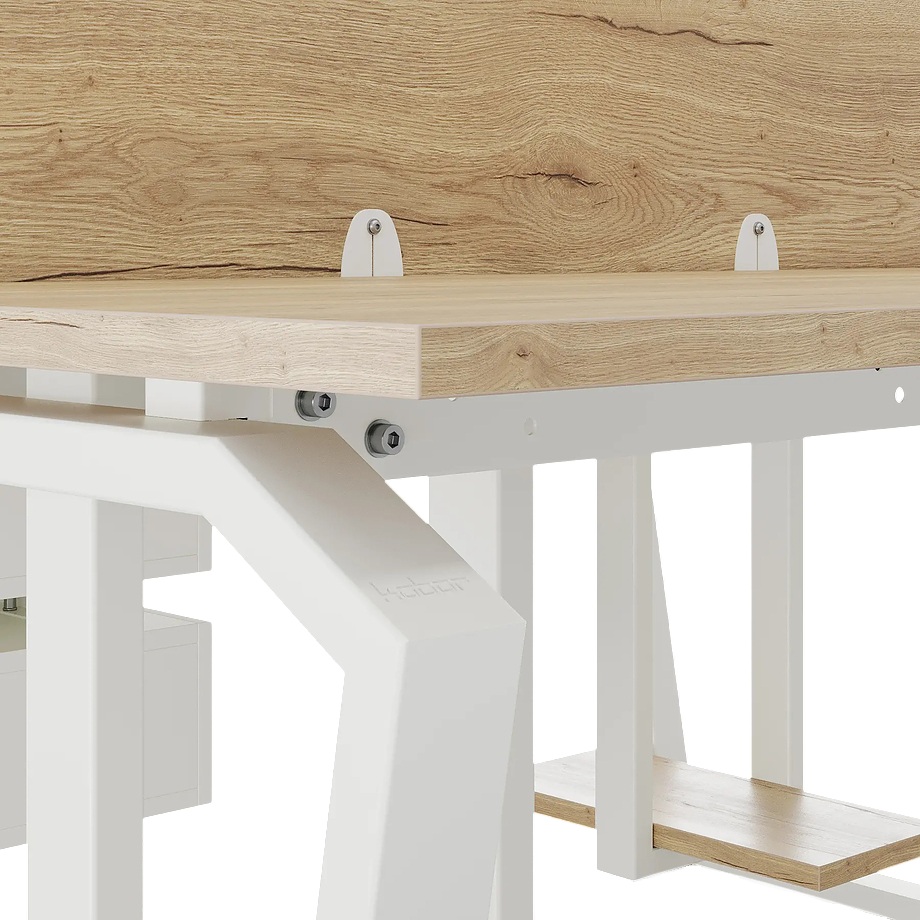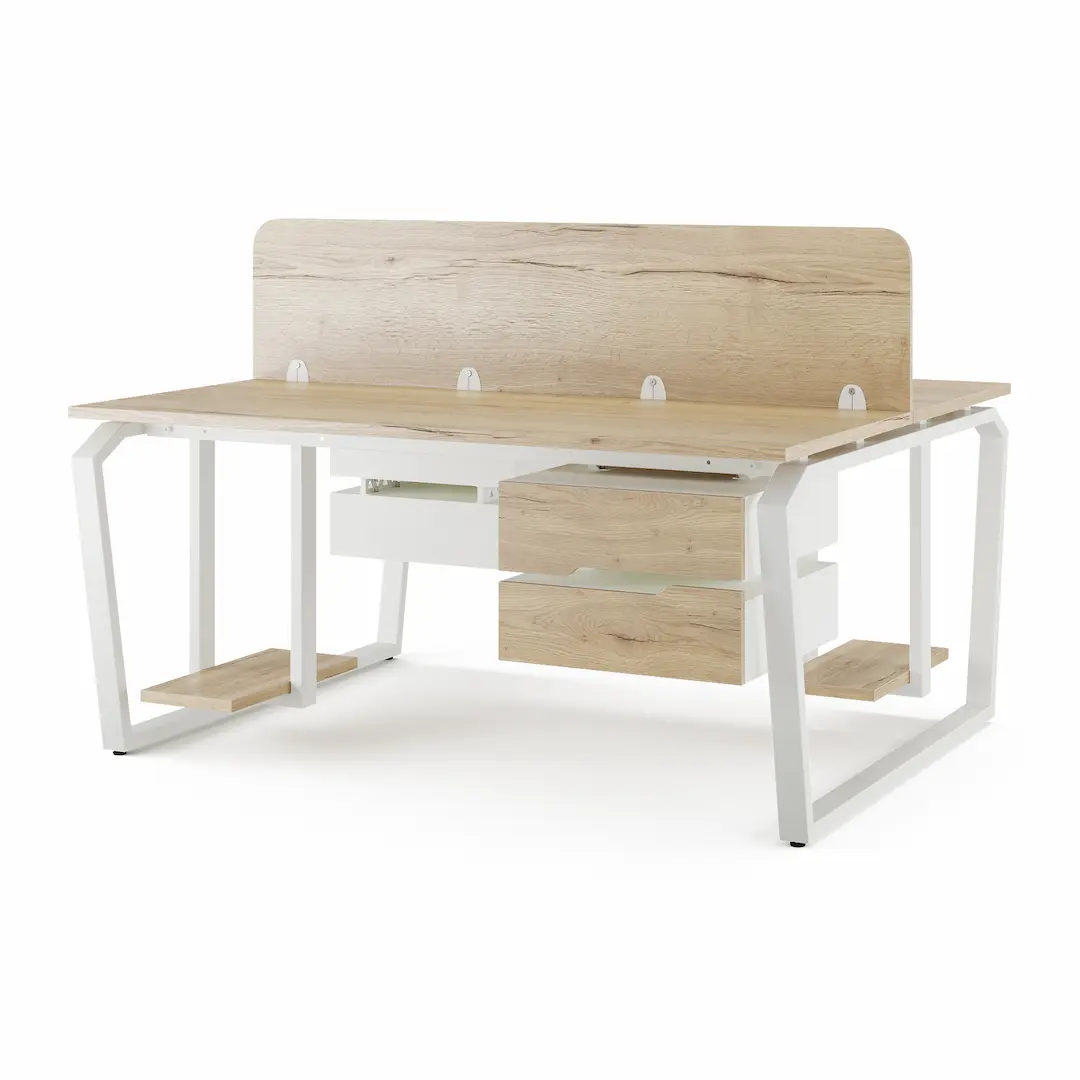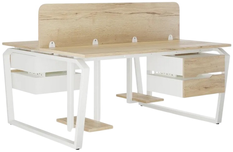 Офисный стол Кобор TB/2-140/140 white/natural предназначен для двух рабочих мест и идеально подходит для офисов и кабинетов руководителей. Модель оснащена опорами в виде обратной трапеции с скошенными верхними углами. Материал столешницы - прочный ЛДСП толщиной 25 мм, усиленная снизу металлическим каркасом, материал опор и каркаса - окрашенный металл.