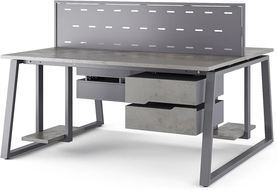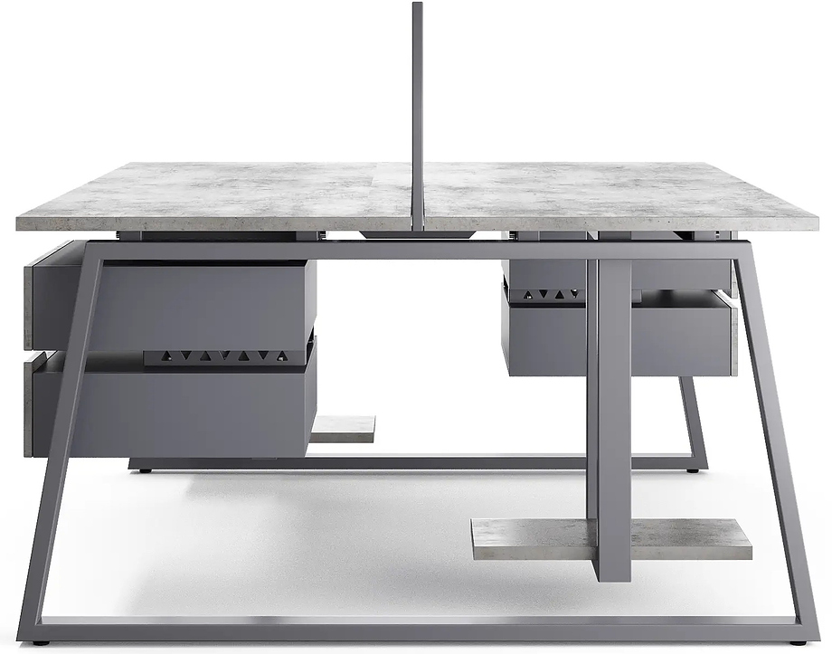 Офисный стол Кобор TR/2-140/140 graphite/chicago предназначен для двух рабочих мест и идеально подходит для офисов и кабинетов руководителей. Модель оснащена опорами в форме трапеции. Материал столешницы - прочный ЛДСП толщиной 25 мм, усиленная снизу металлическим каркасом, материал опор и каркаса - окрашенный металл.
