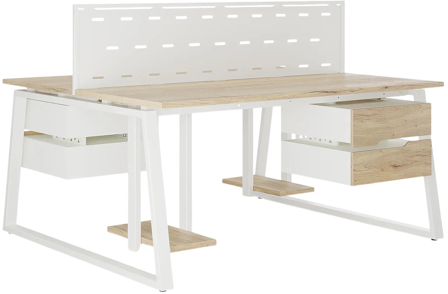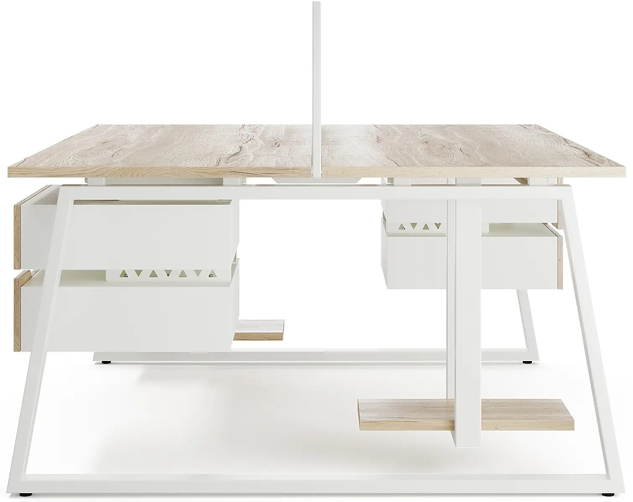 Офисный стол Кобор TR/2-80/120 white/natural предназначен для двух рабочих мест и идеально подходит для офисов и кабинетов руководителей. Модель оснащена опорами в форме трапеции. Материал столешницы - прочный ЛДСП толщиной 25 мм, усиленная снизу металлическим каркасом, материал опор и каркаса - окрашенный металл.