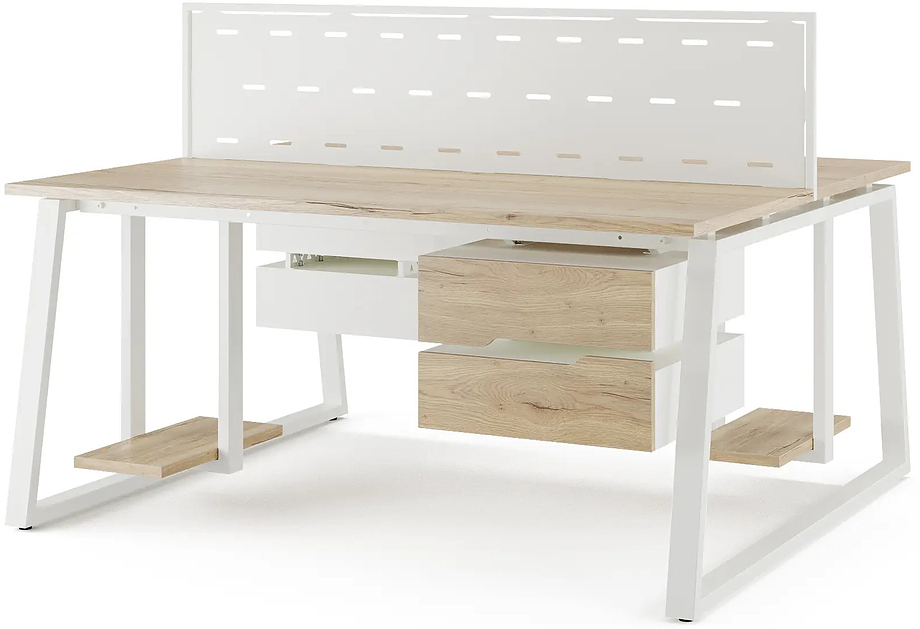 Офисный стол Кобор TR/2-140/140 white/natural предназначен для двух рабочих мест и идеально подходит для офисов и кабинетов руководителей. Модель оснащена опорами в форме трапеции. Материал столешницы - прочный ЛДСП толщиной 25 мм, усиленная снизу металлическим каркасом, материал опор и каркаса - окрашенный металл.