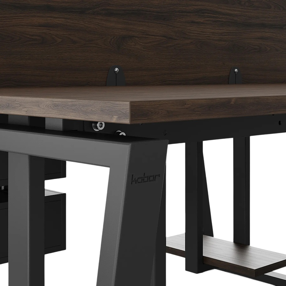 Офисный стол Кобор OTR/2-140/140 black/charlston предназначен для двух рабочих мест и идеально подходит для офисов и кабинетов руководителей. Модель оснащена опорами в виде обратной трапеции. Материал столешницы - прочный ЛДСП толщиной 25 мм, усиленная снизу металлическим каркасом, материал опор и каркаса - окрашенный металл.