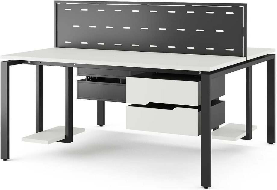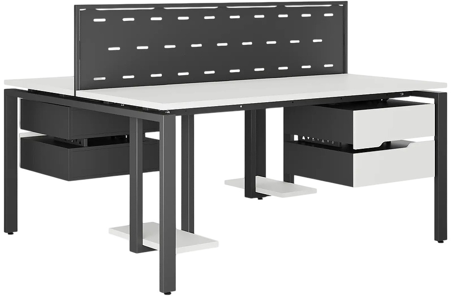 Офисный стол Кобор P/2-140/140 black/premium предназначен для двух рабочих мест и идеально подходит для офисов и кабинетов руководителей. Модель оснащена П-образными опорами. Материал столешницы - прочный ЛДСП толщиной 25 мм, усиленная снизу металлическим каркасом, материал опор и каркаса - окрашенный металл.
