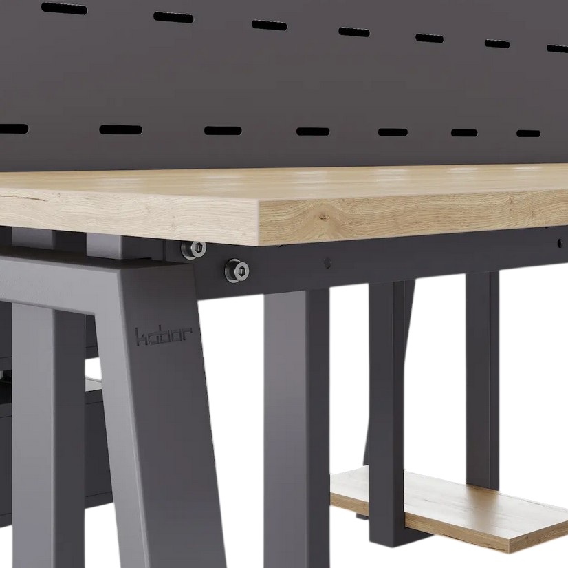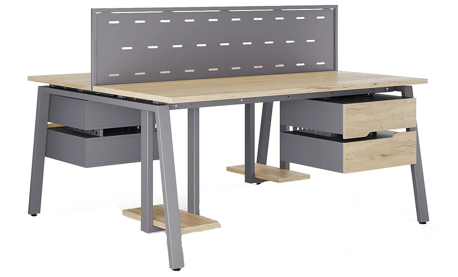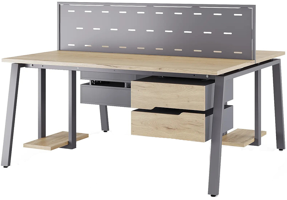 Офисный стол Кобор A/2-140/140 graphite/natural предназначен для двух рабочих мест и идеально подходит для офисов и кабинетов руководителей. Модель оснащена А-образными опорами. Материал столешницы - прочный ЛДСП толщиной 25 мм, усиленная снизу металлическим каркасом, материал опор и каркаса - окрашенный металл.