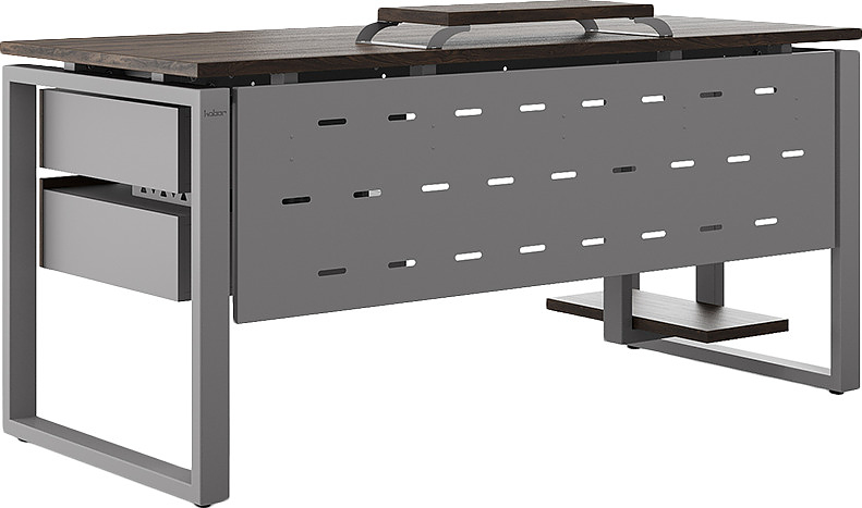 Офисный стол КОБОР O1-120/60 aluminum/charlston используется в офисных помещениях и кабинетах руководителей. Модель оснащена О-образными опорами. Материал столешницы - прочный ЛДСП толщиной 25 мм, усиленная снизу металлическим каркасом, материал опор - окрашенный металл.