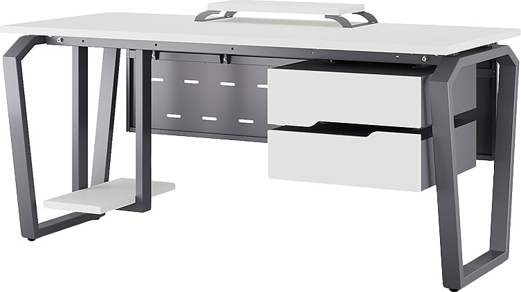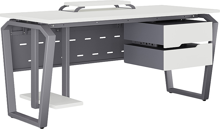 Офисный стол КОБОР TB-120/60 graphite/premium используется в офисных помещениях и кабинетах руководителей. Конструкция модели включает опоры, выполненные в виде перевернутой трапеции со скошенными верхними углами. Материал столешницы - прочный ЛДСП толщиной 25 мм, усиленная снизу металлическим каркасом, материал опор - окрашенный металл.