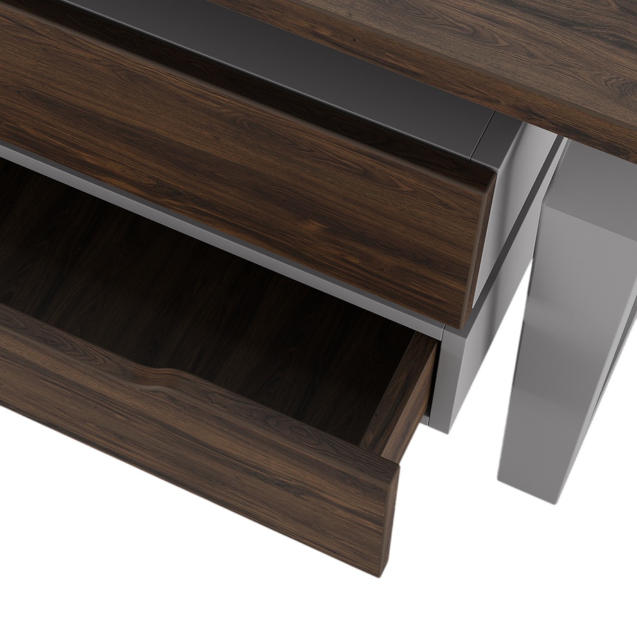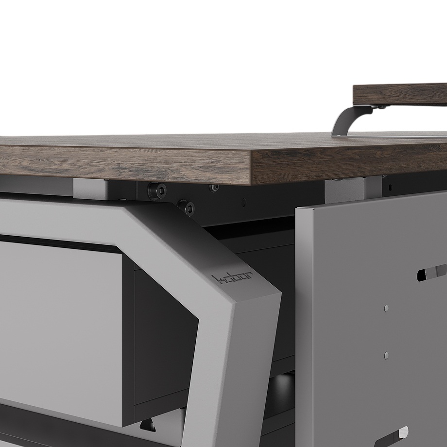 Офисный стол КОБОР TB-140/70 aluminum/charlston используется в офисных помещениях и кабинетах руководителей. Конструкция модели включает опоры, выполненные в виде перевернутой трапеции со скошенными верхними углами. Материал столешницы - прочный ЛДСП толщиной 25 мм, усиленная снизу металлическим каркасом, материал опор - окрашенный металл.