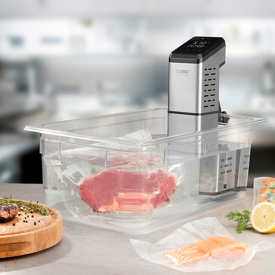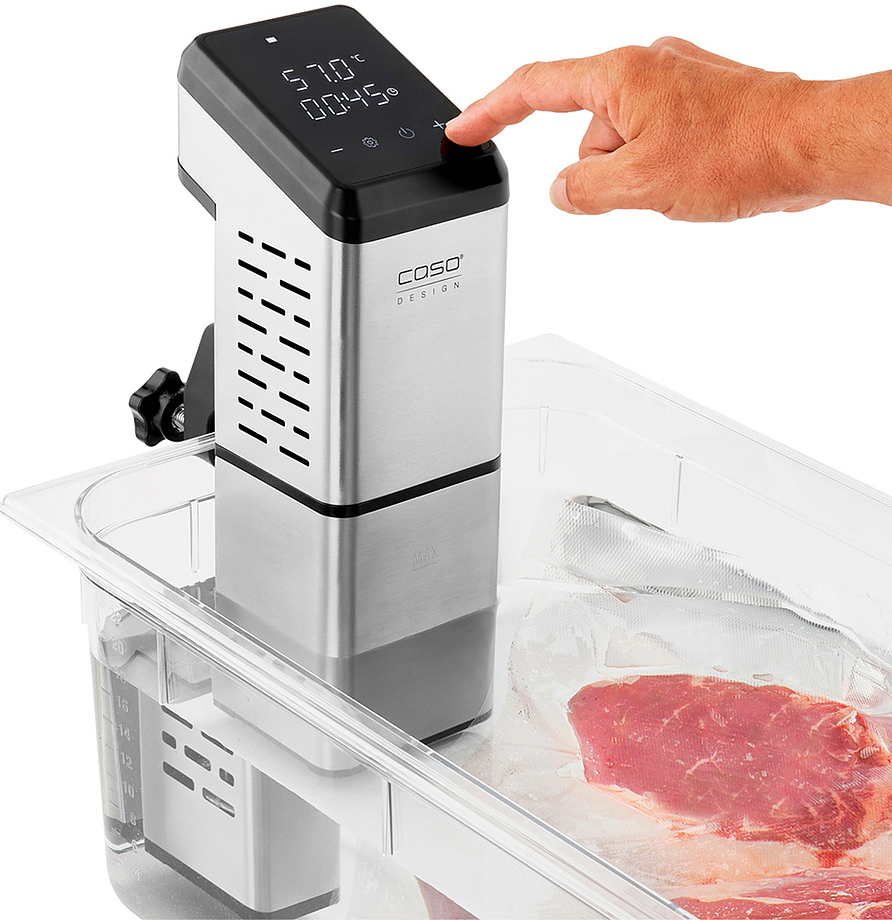 Аппарат Sous Vide CASO SV 2000 Pro используется на предприятиях общественного питания, торговли, пищевых производствах и в домашних условиях для приготовления пищи в герметичных пакетах, погружённых в горячую воду при низких температурах, что помогает сохранить питательные вещества, витамины и минералы, а также обеспечивает яркий вкус мяса и овощей. Модель оснащена сенсорным управлением, защитой от перегрева, таймером и световым индикатором. Материал корпуса - высококачественная нержавеющая сталь.